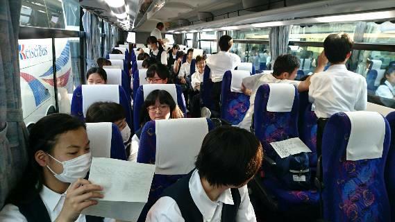 ○すべて順調に進行し、今、駐車場から出発しました。車内では学級通信が配布され、修学旅行後の予定等の確認をしています。隣のバスの方が気になっている生徒もいるようですね。(校長)