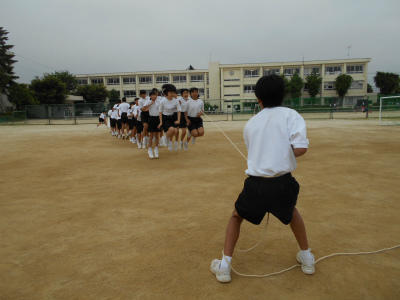 担任の先生を中心に準備運動をしてから長縄跳び練習を行いました。
