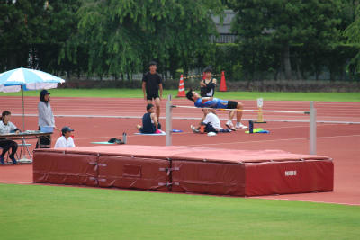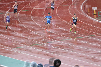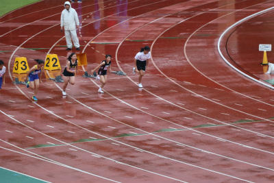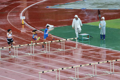 〇雨が降り続く中、学校総合体育大会地区予選会が行われています。野田市総合公園陸上競技場では、陸上競技の部(第1日)が始まりました。雨のため、スタンド席にはほとんど人の姿は見られませんでした。しかし、全天候型の競技場のため、係員が雨の中準備をしていました。選手たちは重くなったユニフォームを身につけ、走りづらそうに見えましたが、条件は皆同じ、ゴールを目指してがんばっていました。