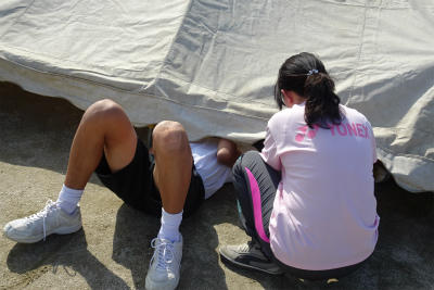 ☆テントのひもを結んでいます。自動車の修理みたいですね。