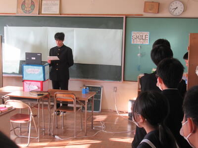 12月16日(木) 今朝の生徒会朝会では、各学級委員長と各委員会委員長からの挨拶・連絡をリモートで行いました。後期の委員会はスタートしたばかりですが、各部署ともヤル気にあふれている様子です。
