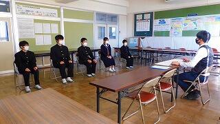 12月9日(木)1学年では2学期に入って職業学習を中心に自分の将来について考える活動を進めてきました。今日はこれまでの進路学習の一環としてのグループ面接を実施しました。豊春小の松原校長先生や宮川小の田矢校長先生、上根PTA会長にもお力添えをいただき、校長・教頭を含めた5名の面接官によるグループ面接を行いました。将来の夢や関心のある職業、自分の長所や尊敬する人物など多くの質問に対して生き生きと礼儀正しく回答する成長した1年生の姿がありました。