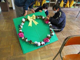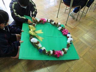12月14日(火)寒さも徐々に厳しさを増し早いもので12月中旬を迎えています。6・7組で先週から作成し始めたクリスマスリースが完成して明日以降昇降口に飾る予定です。