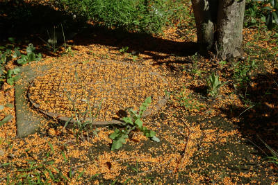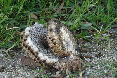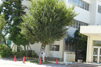 〇台風24号は、非常に強い勢力を維持したまま日本列島を縦断していきました。場所によっては風速50㎞を上回り、交通機関では早々に運休にするといった対策も採られました。学校へ着いてみると、大きな支障はなかったものの、満開に咲き誇っていたキンモクセイの花が散ってしまったり、木々の葉も枯れてしまったように見えました。そして驚いたのは、新館の昇降口前の木の下に、蜂の巣が落ちていたことです。早速業者の方に連絡し駆除していただきました。蜂の巣は、下半分が落ちてしまったらしく、木の中に残った巣も取り払っていただきました。蜂は、コスズメバチ(コガタスズメバチ)という種類だそうで、攻撃的な種類ではないようですが、かまうと攻撃される恐れもありますので十分注意してください。日中だったので、飛び立っていた蜂が巣を探しているため、3日間くらいは近寄らない方がよいそうです。よろしくお願いします。(校長)