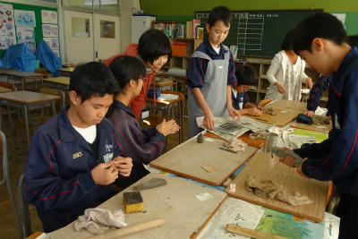 ○6,7組は、美術室で陶芸に取り組んでいました。教室の水槽にいるウーパールーパーを作っていたり、箸置きやお皿を作っていたり、それぞれが思い思いに陶芸を楽しんでいました。廊下の掲示板には、書き初めの作品がきれいに張り出され、静かに1年のまとめをしているようにも見えました。