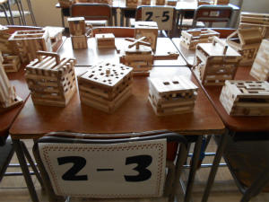 また、1階第2美術室では「1・2年生の美術作品展」を開催しています。木製輪付きスプーンや寄せ木工芸など、素晴らしい作品が並んでいます。御来校の折には、是非お立ち寄りください。