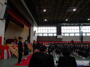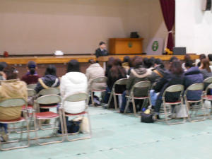 1・2年生が先生と一緒に体育館で式の準備をしています。式場づくりには大変時間がかかります。卒業する3年生の門出のために心を込めて取り組みます。