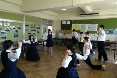 ○本日、第1回の職員会議が開かれました。年度初めの大切な会議です。会議を始める前に、混声合唱団と教職員で豊春中の校歌を披露して、新しく来られた先生方をお迎えするのが恒例の行事です。会議室に行ってみると、混声合唱団の生徒たちが発声練習を行っていました。体全体を使って声を出しているのですね。