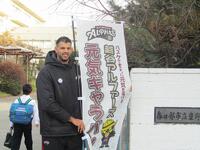 本日、プロバスケットボールチームの越谷アルファーズから3名の方が来校し、朝の時間帯に生徒会本部役員と一緒にあいさつ運動をしてくれました。中には、アルファーズの選手と分かり握手や写真撮影を求めた生徒もいて、選手の方は快く応じてくれていました。最後は「のぼり」と「ポスター」にサインをしてくれました。ありがとうございました。