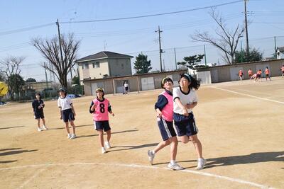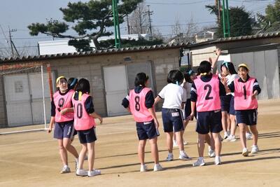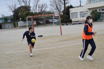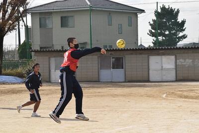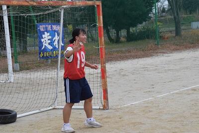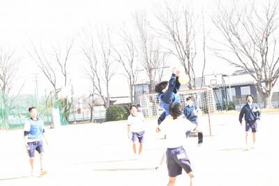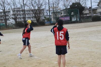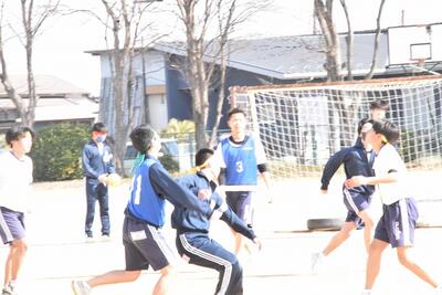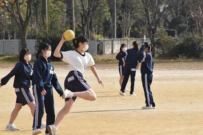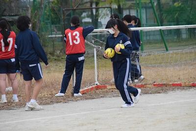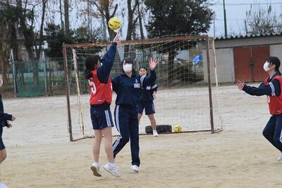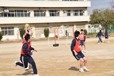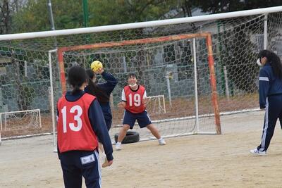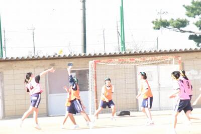 校庭ではハンドボール、体育館ではバレーボールが行われています。