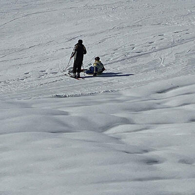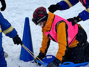 「模擬夫婦」となり、男女で3Kgのリュックサックをお腹側に背負って、