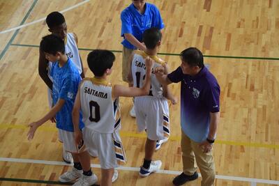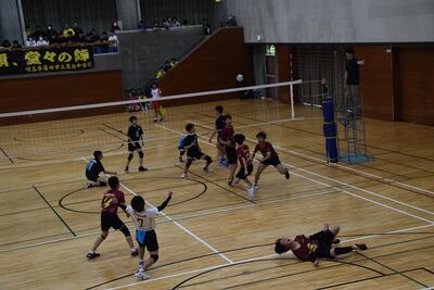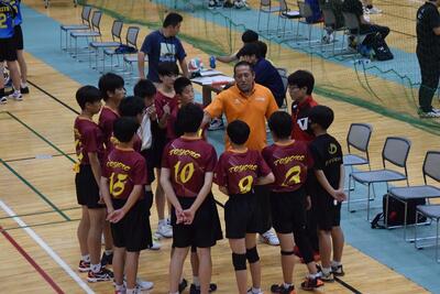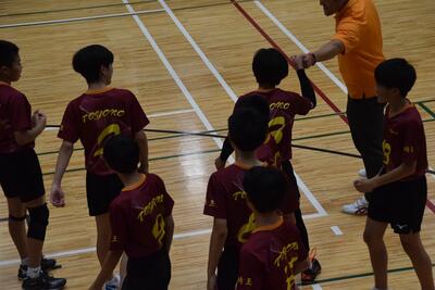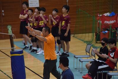 2年生が先輩として1年生に集団走、準備体操、声出しのやり方を教えています。
