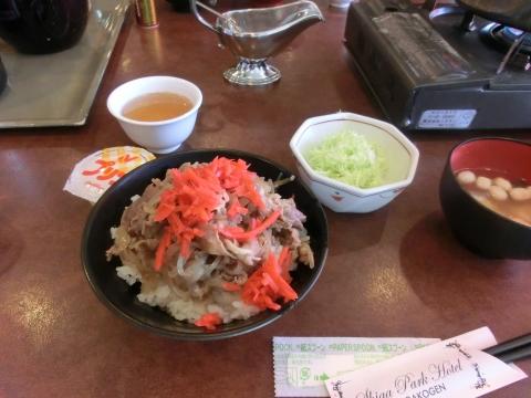 ホテルの人に御礼を述べた後昼食となりました。メニューは牛丼です。予定より15分早く12時25分にホテルを出発しました。ホテルの人やインストラクターさん、おこみん、猿までお見送りしてくれました。