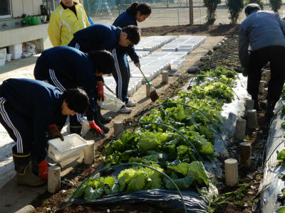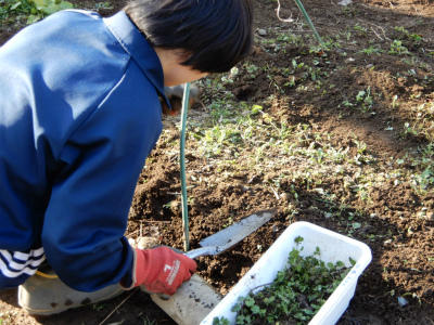 7・8組は畑の作業です。キャベツ、白菜、レタスにかけてあるシートを外して、