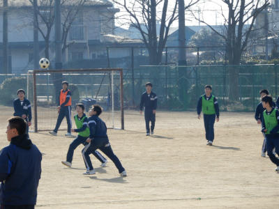 3-123組は元気にグラウンドでサッカーの授業です。体育館では女子が楽