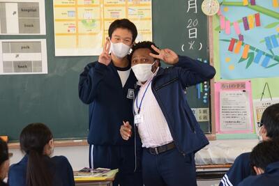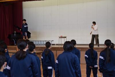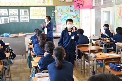 給食から1年5組の教室で食を共にし、昼休みも生徒とコミュニケーションを図っていただいた後に自ら道徳師範授業をしていただきました。