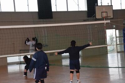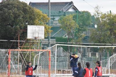 校庭ではハンドボール、体育館ではバレーボールが行われています。