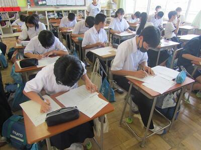 本日は、3年生が東部地区テスト、1・2年生が実力テストと全ての学年がテストでした。今日は雨で湿度が高かったですが、先週までのような高い気温ではなかったので、テスト日和(!?)だったと思います。真剣にテストに臨んでいる生徒の様子をご覧ください。