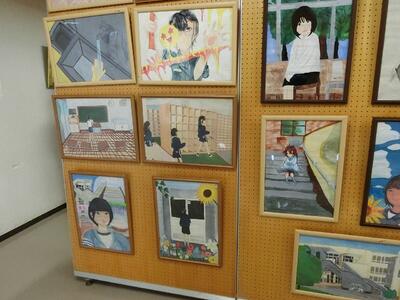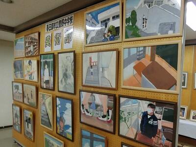 昨日、豊野市民センターにて、50周年記念豊野地区文化祭が開催されました。銚子口の獅子舞や「あとかくしの雪」(語り部)などの様々な発表が行われました。2階の作品展示会場では、特別展示として、豊野中学校美術部のブースがあり、絵画が展示されていました。
