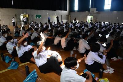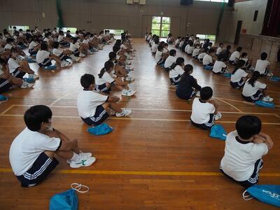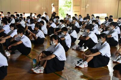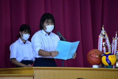 1学期の終業式が行われました。終業式に先立って、埼玉県弁護士会から講師として弁護士の先生をお迎えし、非行防止教室が行われました。実際に全国各地で起こった悲惨ないじめの事例をもとに、大変ためになるお話をいただきました。その後の終業式では、校長先生のお話、各学年代表生徒の発表、夏休みの過ごし方についての話しのあとに、たくさんの頑張りに対する表彰がありました。