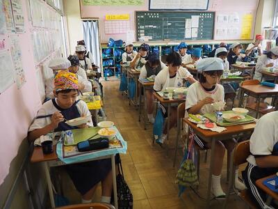 今日で1学期の給食は最後でした。1学期間、給食室の厳しい環境の中、私たちのために毎日安心・安全な給食を作ってくださった給食調理員のみなさん、栄養士の先生、生産者の方々をはじめ、給食に携わってくださった皆様どうもありがとうございました。