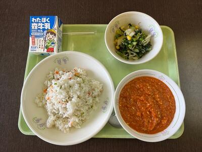 今日の給食 メキシコ風ピラフ ミートソース 青菜とじゃこのサラダ