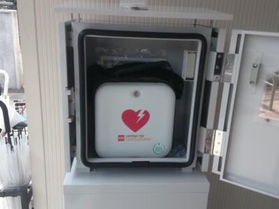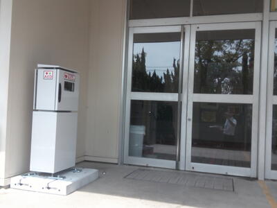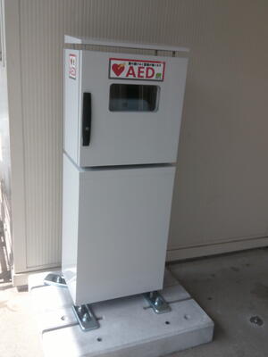 校舎内(職員室前)に加え、体育館前(外)にAEDが設置されました。
