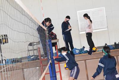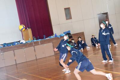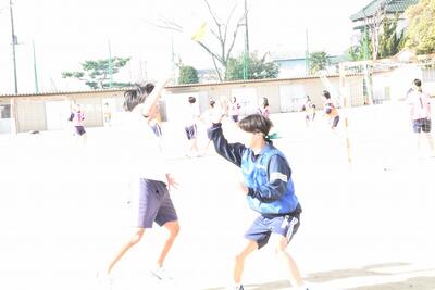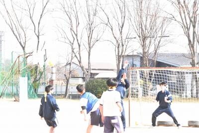 校庭ではハンドボール、体育館ではバレーボールが行われています。