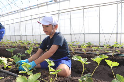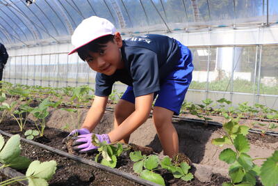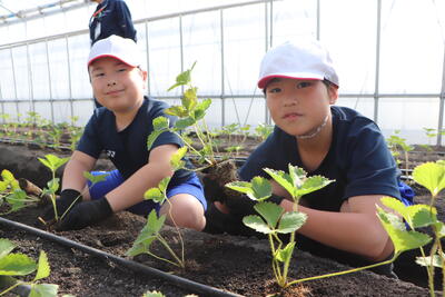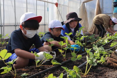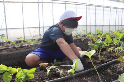3・4年生が総合学習でイチゴの苗植えに行きました。
