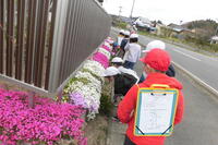 川内小中学園の校舎改築に伴い、1年生の時は元の中学校校舎で生活していた子ども達。本校舎の周りには何があるのかなと、ワクワクドキドキしながら学校を出発しました。春らしく温かい陽気の中、きれいに咲きそろった芝桜に鼻を近づけて、花と春の香りを楽しんだり、学校周辺にある施設を調べたり、お地蔵さんやモリタロウが刻印されたマンホールなどを発見したりもしました。