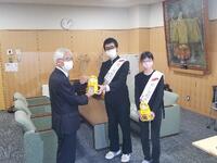 先月、各家庭のご協力をいただいて赤い羽根募金を行いました。本日は、その募金を生徒会長、児童会代表が副村長さんに手渡ししました。