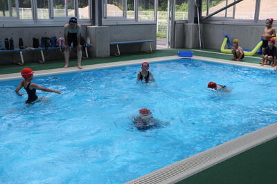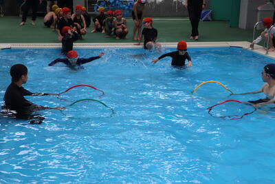 低学年はフラフープくぐりや石拾い、自由形や平泳ぎ、高学年は50mや100m以上の泳ぎなど、それぞれの目標に沿った内容で取り組みました。