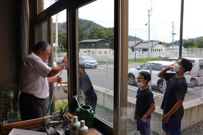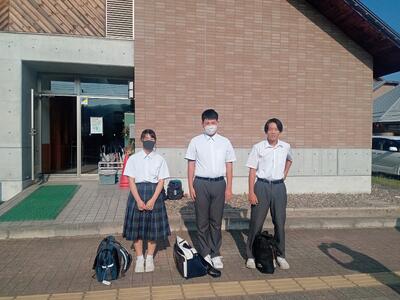 英語弁論大会に出場する9年生の猪狩愛里さん、松崎行雲さん、秋元湊太さんが会場の浮舟文化会館に出発しました。
