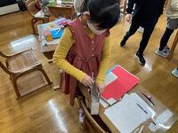 色画用紙や空き箱、割りばしなどの材料を用いて自分の思いを表現しています。磁石の性質を用いると、作品に動きが加わります。どんな動きをしたらおもしろいかなと工夫して作品づくりに取り組む姿が見られました。
