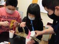 次に、科学・パソコンクラブでは、スライム作りを行いました。上級生に作り方を教えてもらいながら、自分の好きな色を混ぜています。どんどん固まっていき、スライムが完成すると、とても喜んでいました。