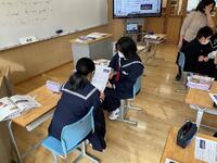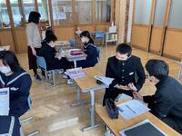 8年生の英語では、世界遺産についての英文を読み、ペアで話し合って、日本語に訳しています。