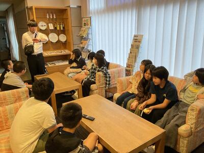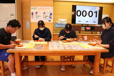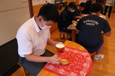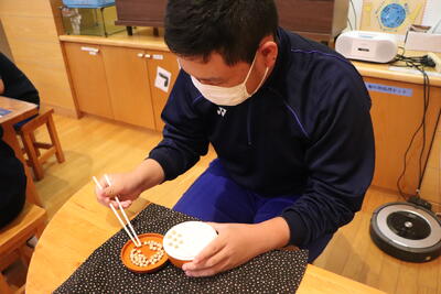 9年生の皆さんはお箸を巧みに使って、豆を上手に移していました。