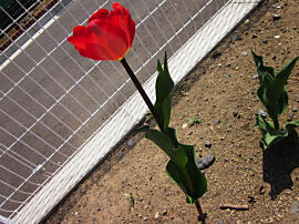 暖かい日が続き、花が咲き始めました。1週間前白いチューリップ咲きました。しかし、赤と黄色がなかなか咲いてくれず心配していた子どもたち。「先生~!赤と黄色のチューリップはどうしたのかなぁ~?」毎日毎日、戸外遊びの際は期待して見ていました。
