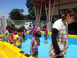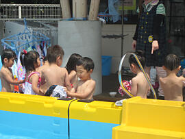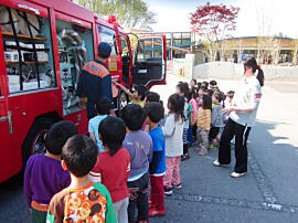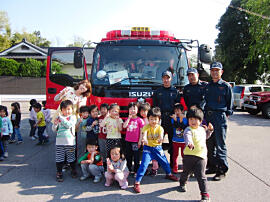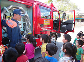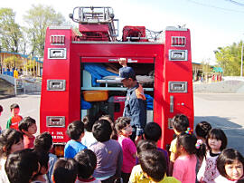 町内をパトロールしていた消防車がみずはし保育園にやってきました。お昼寝が終わると大きいクラスのお友だちが「保育園に消防車がいるよ~」と大騒ぎ。さくら組、ゆり組のお友だちは、慌ててパジャマから洋服に着替え消防車の待つ駐車場へ。消防士のお兄さん(笑)は、とっても優しくとってもかっこよかったです。