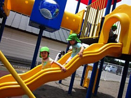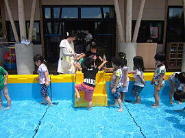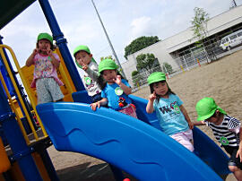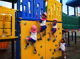 レッスンの後は大好きな外遊びです。たんぽぽ組になり大型遊具が使えるようになりました。