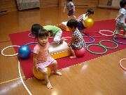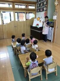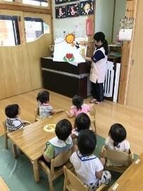 たんぽぽ組の子どもたちは、はじめての「えいごであそぼう」に興味津々!(^^)!講師の先生の発音を聞いて元気にリピート