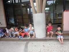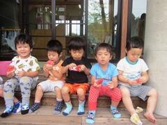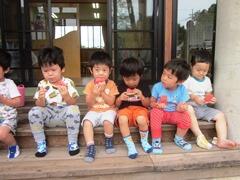 「みんなで食べるとおいしいね」・「お外の食事はさいこうだねっ」子どもたちは大満足(^^♪