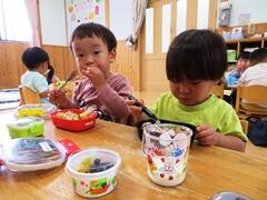 ゆり組・さくら組の子どもたちは、元気にあそんで給食をもりもり食べて