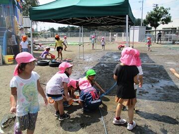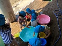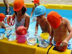 楽しみにしているプールを設置してくれたのは、力持ちのお父さんたち!!あっという間にプールが完成しました。お父さんたちには感謝の気持ちでいっぱいです。