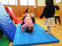 マットの上の足跡マークを歩いたり、跳び箱からジャンプしたり、トンネルをくぐったりと楽しんでいました