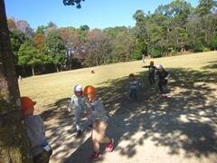 園庭ではカシの木の下で「どんぐりあるかなー」、「どんぐり落ちてこーい!」とどんぐり探しに夢中です。