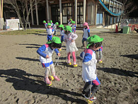 すみれ・たんぽぽ・ゆり・さくら組は、戸外にて豆まきをしました。鬼が登場すると・・・やっぱり鬼は怖い・・・先生の後ろに隠れたり、デッキに逃げてしまったり。そんな中1番大きいさくら組さんは、違いました。去年は泣いてしまったお友達も今年は泣くことなく、しっかりと豆まきをすることができました。