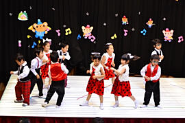 たんぽぽ組遊戯です。黄色・きみどり。白のポンポンは、たんぽぽをイメージしたそうです。がんばりましたね。