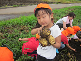 保育参加のお母さん方にも手伝っていただき、子どもたちも真っ黒になりながら一生懸命掘り、たくさんのじゃがいもが採れました\(^o^)/