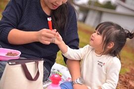 お箸を使って上手に食べられるようになったね。 風呂敷結びも一人でできるようになったね。トイレの心配もなくなった…自分でできることいっぱい。